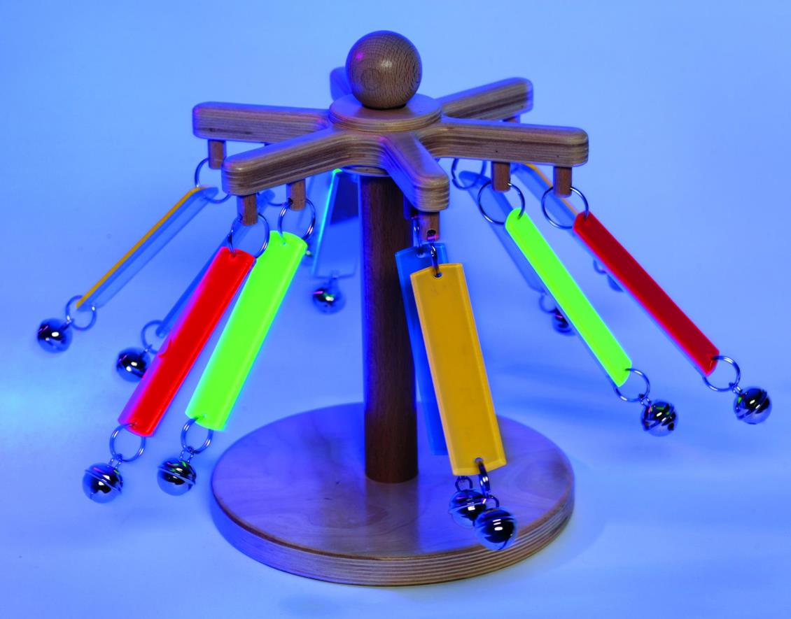 Aan het houten molentje van 20 x 24 cm hangen vrolijk gekleurde spiegelstrips met een belletje. Door het molentje rond te draaien ontstaan aantrekkelijke licht- en kleureffecten, gecombineerd met een vrolijk getinkel van de belletjes. De vormgeving kan enigszins afwijken van de getoonde afbeelding.