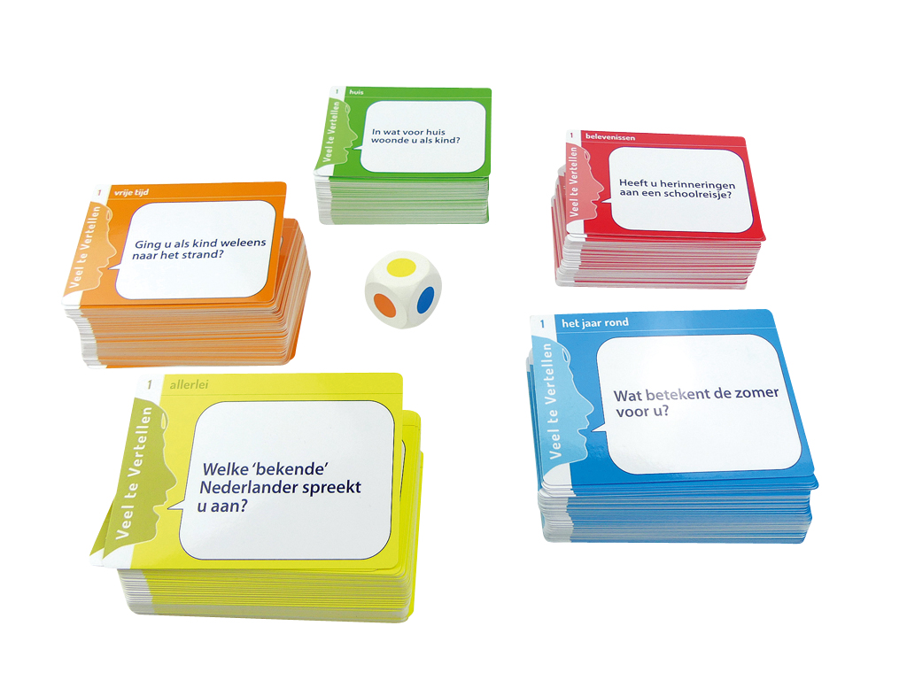 Dit spel is eind 2017 vernieuwd: de spelkaarten zijn groter en mooier vormgegegeven met afgeronde hoeken. Professioneel gelamineerd zitten ze verpakt in een kunststof doosje. De handleiding is ook uitgebreid. De koffer bevat vijf sets van 60 vragen, in totaal dus 300 vragen. Elk van de vijf thema’s heeft zijn eigen kleur. Gekozen is voor open vragen, waarbij de persoonlijke ervaring voorop staat. Daardoor is er niets fout, zijn alle antwoorden goed. Dat is een wezenlijk verschil met andere spellen. De vragen nodigen uit om veel te vertellen: over de schoonmaak, seizoenen, liefhebberijen, het weer, feestdagen. Enkele voorbeelden: Van welke muziek hou je? Welke sieraden vindt je mooi? Ben je ergens voor aan het sparen? Bent je wel eens naar een museum geweest? Veel te Vertellen is een leuke manier om aandacht te besteden aan gebeurtenissen van alledag en is geschikt voor (bijna) alle volwassenen.