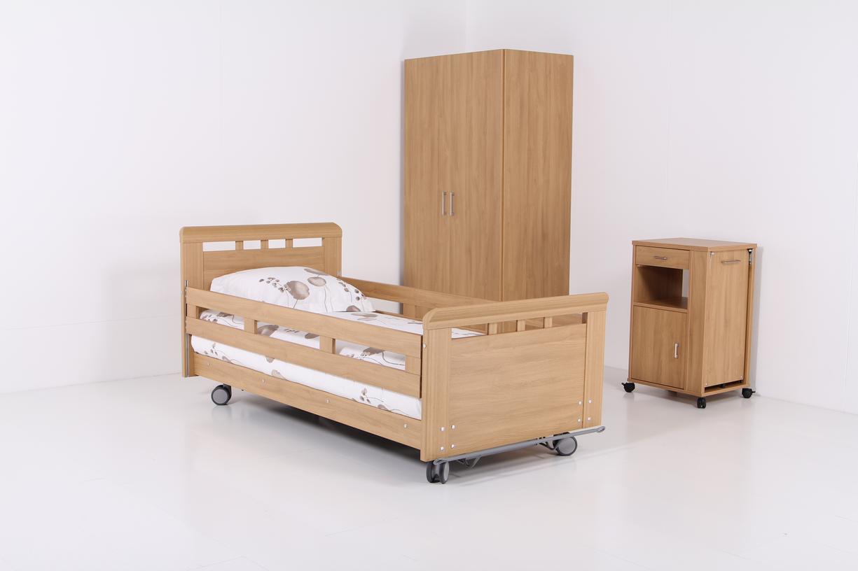 Dit 'All-in-one' verpleegbed voldoet aan alle eisen op het gebied van comfort en ergonomie van een modern zorgbed. het is verkrijgbaar in verschillende, aansprekende houtdecoren. Het zorgbed Elbacare is bijzonder geschikt voor gebruik in verpleeghuizen, maar kan uiteraard ook uitstekend in een huiselijke omgeving worden toegepast.Het bed heeft een 4-delig, stalen ligvlak van 90 x 200 cm met matrasbeugels aan het hoofd- en voeteneinde. Elektrische verstelbare rugleuning tot 70º en bovenbeenverstelling tot 30º. Onderbeenondersteuning mechanisch instelbaar in 5 standen. Daarnaast is het bed voorzien van een nood-daalfunctie via 9 volt batterij, in geval van een stroomstoring. Draaggewicht tot 185 kg, veilige werkbelasting tot 220 kg.