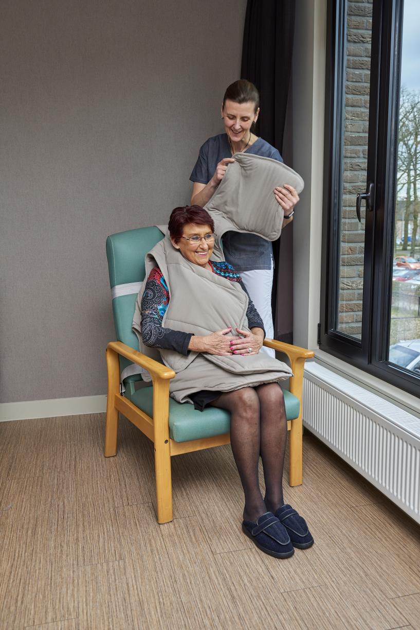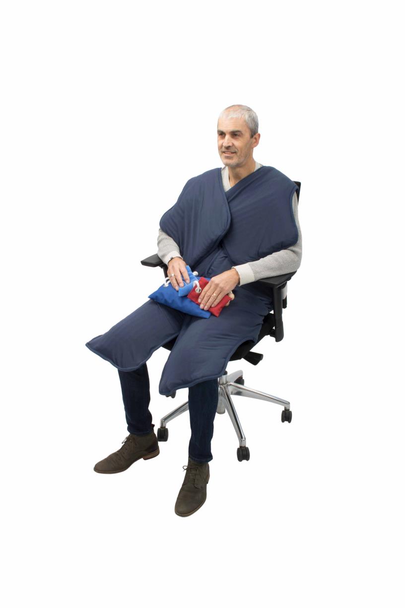 Verzwaringsartikelen worden gebruikt voor druk op het lichaam. Een verzwaringsartikel dat gevuld is met granulaat volgt perfect de contouren van het lichaam. Het heeft bovendien het voordeel dat je weinig vulvolume nodig hebt om genoeg druk uit te oefenen, zodat het artikel op zich niet echt dik hoeft te zijn. Dit is praktisch in een warme omgeving en makkelijk in onderhoud. Rustdeken in kwaliteit 1010 gewatteerd, licht verzwaarde zijstroken aan bovenbeen, taille en schouder, past op elke zetel met voldoende hoge rugleuning.