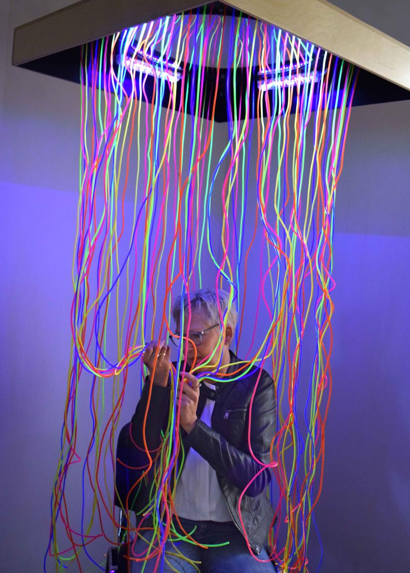 Een spannend snoezeleilandje omgeven door een gordijn van fluosnoer. Vier UV LED armaturen zorgen voor een warme gloed van fluorescerend licht dat de snoeren (lengte 180 cm) prachtig uit laten komen. De aan de bovenkant gemonteerde bolle spiegel geeft een extra ruimtelijk effect. Afmeting: 90 cm x 90 cm Het artikel wordt compleet geleverd zoals afgebeeld.